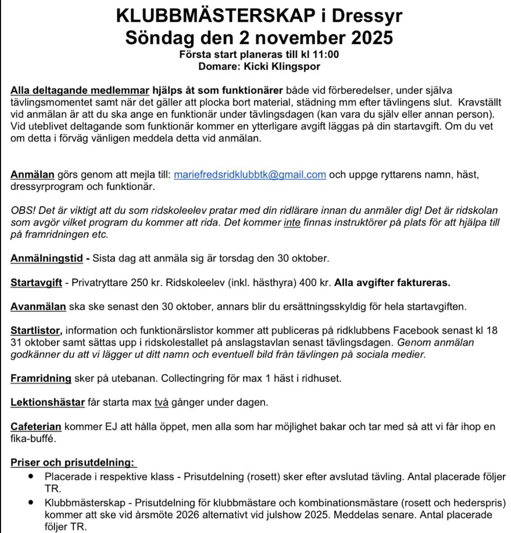 Nu är anmälan öppen till årets Klubbmästerskap i dressyr!